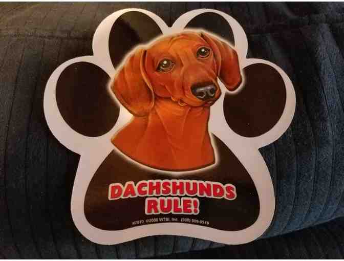 This paw print shaped magnet featuring a red short haired dachshund with the saying "Dachshunds Rule! is 5" x 5" in size.