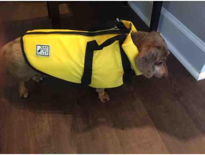THE FIDO FLOAT offers superior comfort, safety and flotation for dogs in or around the water. This life vest straps adjust to fit snugly and handles assist in lifting pet from the water. The Fido Float makes boating safer for dogs. Design Benefits: The exclusive tail to collar opening and closure makes Fido Float easy to put on and take off your dog Superior Fit! the shape of the vest follows your dog's contours to prevent twisting, stepping or swimming out of the vest Reflective label and bright YELLOW vest color helps keep your pet in sight day or night Specially placed handles make it easy to pick your pet up out of the water Fabric Benefits: quality, lightweight and durable materials Easy to clean. Wash warm and hang dry Common sense warnings: Animals using this product should be under close supervision at all times Remove vest after each swim, your pet needs to shake dry. Size Small: Girth 18"x22" SIZING YOUR DOG: Measure the circumference of chest just behind the front legs at its deepest (largest) point.
