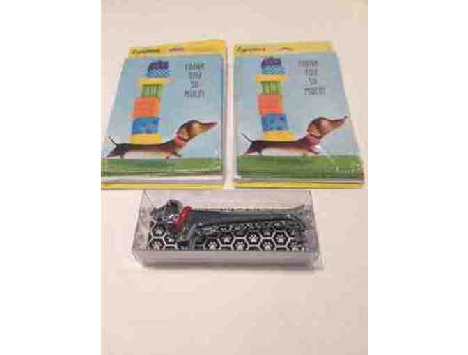 2 packages (8 notes to a package) of Doxie Thank you Notes. Blank inside. Write you thank yous with this adorable silver doxie pen. Great gift idea, too!