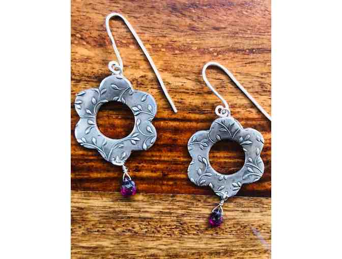 Textured sterling flower earrings made with metal clay, with garnet drops on sterling ear wires.
