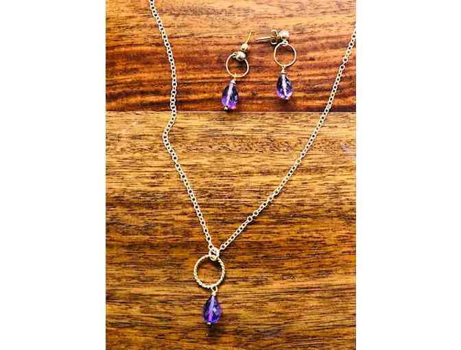 Pendant and earrings: amethyst drops on 14kt gold filled chain and ear posts. 17 inches long, including clasp but not including pendant.