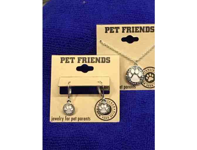 You are bidding on an adorable paw print earring and necklace set by Pet Friends! They are white enamel paw prints circled with cubic zirconia stones. What a great Mother's Day gift! The necklace is unique that it can be worn short or long. See the picture! The necklace is almost .75" in diameter. The earrings are a little over 3/8".