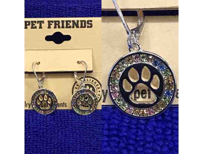 Earrings-- Pet Friends Silver Tone Paw Prints circled with multicolor rhinestones