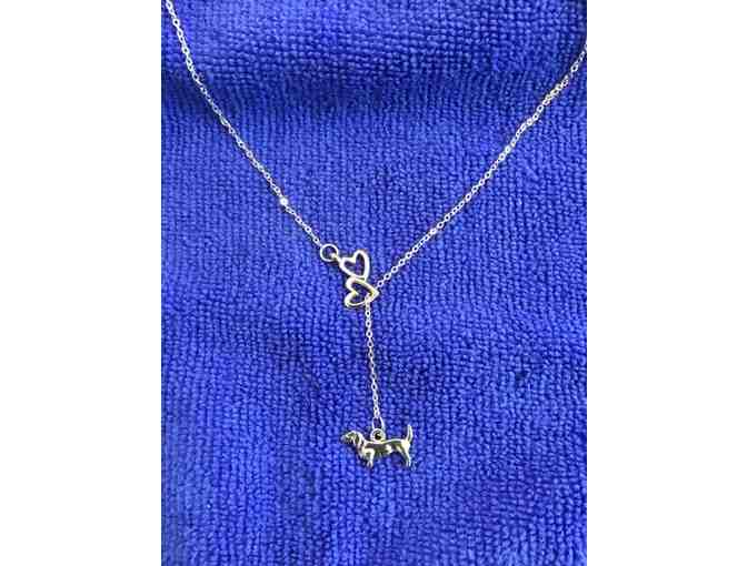Necklace -- Silver tone Sliding dachshund with two hearts