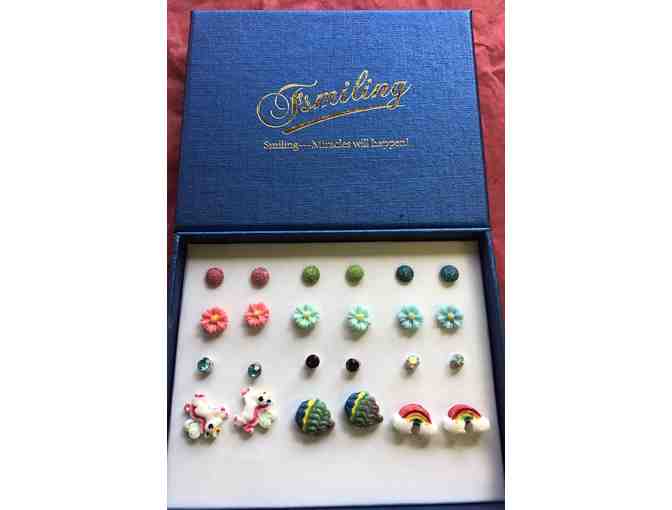 Any young student will enjoy this set of 12 different post earrings that includes flowers, colored rhinestones and rainbows. Comes in a nice gift box and ready to give. Donated by John and Lisa Hickey