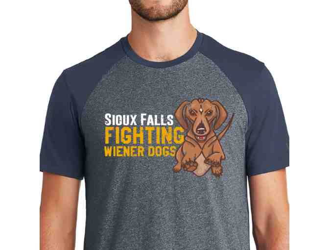 One night a season the Sioux Falls SD Stampede hockey team officially changes its name to "The Fighting Wiener Dogs" in support of Dakota Dachshund Rescue. The team jersey logo for the game features three racing wiener dogs jumping out of a cloud of smoke. Activities at the game include wiener dog races, adoption meet and greet, rescue auction, and sale of Fighting Wiener Dog merchandise all in support of dachshund rescue. What a great event! Size: Large (Chest 44 inches) Fabric: 60% Cotton 40% Polyester Light weight great for summer.