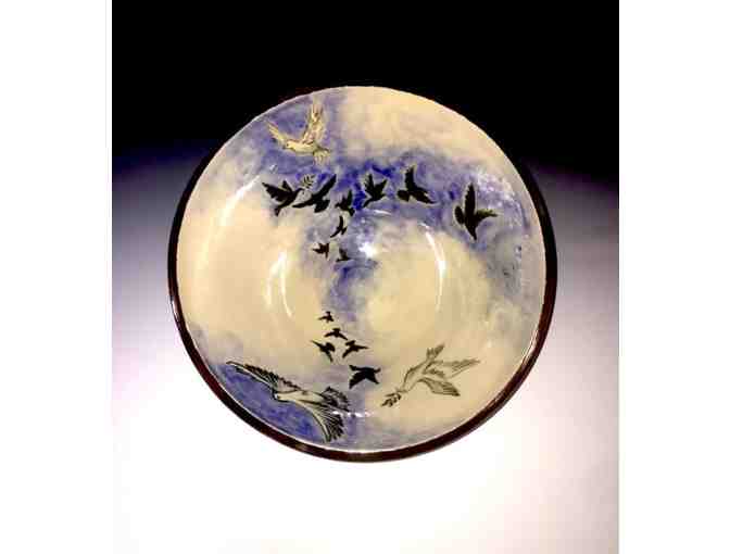 T. Diane and her husband and fellow artist, Skeff Thomas have created this hand-painted ceramic bowl featuring doves and the phrase "May Peace Prevail on Earth" in both English and Spanish. The rim of the bowl is gold luster and this would bowl would be a stunning piece to own! Donated by Diane Driessen and Skeff Thomas