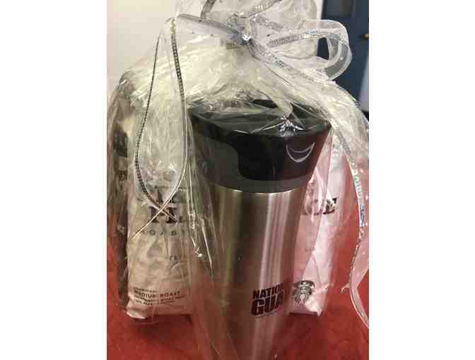 Two bags of Starbucks ground coffee, a stainless steel travel mug and a Gibson 13 piece sensations espresso mug set. Donated by Jennifer McDaniel & Friends of Friends