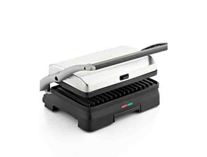 Cuisinart Model GR 11 Grill and Panini Press along with "The Best of the Best Panini Press Cookbook" For succulent steaks, juicy burgers, and crispy grilled sandwiches, get the Cuisinart® Griddler® Grill & Panini Press. The two grill plates can be used for pressing panini and other sandwiches but also open flat to double the cooking surface for a convenient tabletop grill. The preset temperature is optimized for grilling, removing the guesswork from cooking so you can focus on the rest of the meal. And when your dish is ready, cleanup is super easy because the removable grill plates are dishwasher safe! With Power On and Ready to Cook indicator lights, operation is simple! Donated by Arley & Stacey Johnson