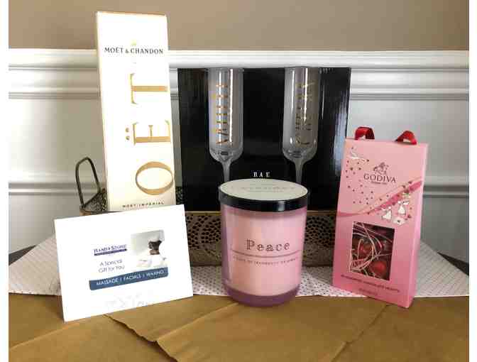 The basket contains a 750ml bottle of Moët brut champagne, a $100.00 gift card to Hand and Stone, a pink Peace candle, small box of Godiva chocolates and two champagne flutes. A great way to unwind and relax after a long week! Donated by Amy Pierce