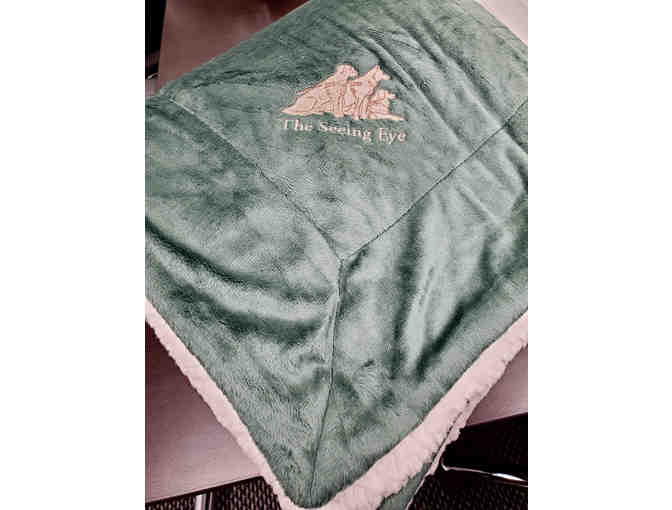 You'll be comfy and warm with this green blanket, embroidered with three dogs in harnesses (a lab, a shepherd, and a golden, all in beige) and the words "The Seeing Eye". One side is green and the other is a cream colored sherpa fabric, perfect for snuggling on a chilly day!