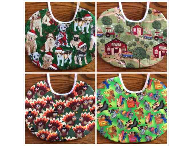 These lovely bibs are hand made, with all letters hand cut. They are made of either cotton or cotton/polyester blends with an interior lining and ties. They are machine washable and dryable.