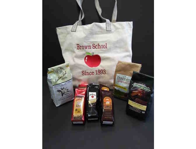 Canvas shopping bag embroidered with "Brown School 1893" filled with various bags of coffee. Coffees include, 1 bag of Chocolate Decadance, 1 bag of Breakfast Blend, 1 bag of French Vanilla, and single pot bags of flavored coffees.