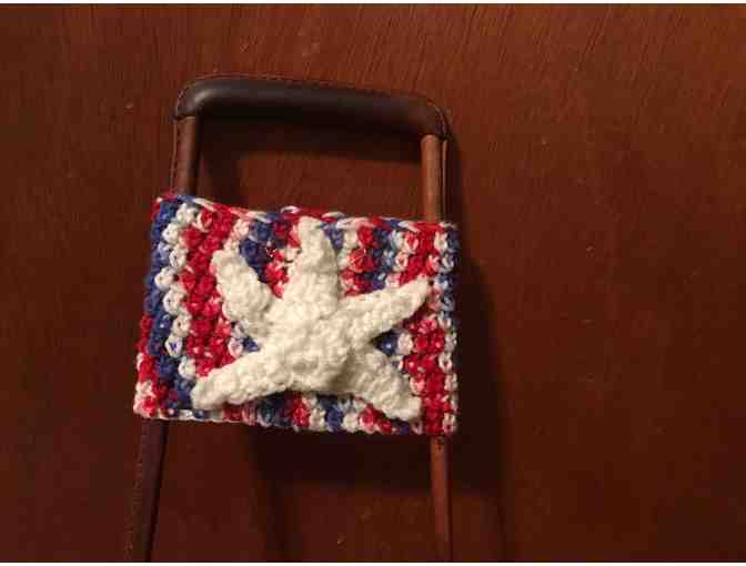 This harness decoration is perfect for any patriotic celebration or gathering. Made with acrylic yarn that is red, white, and blue. The pattern is vertical stripes of red, white, and blue or varying widths. There is a large white star, that is also crocheted and attached to the front. The decoration fits any standard harness handle by sliding down over the handle and has two buttons that help hold it in place and keep it from falling off.