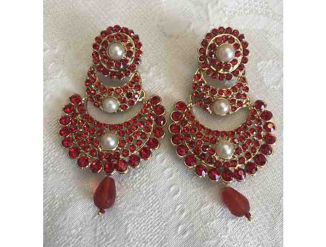 Touchstone is the Premium Fashion Jewelry Brand Of India for over 20 years. They recreate the exquisite treasure of Indian Heritage Jewelry. Splendid Indian Chand baali half moon theme. Recreates Studded Diamond Jewelry. Made of Long lasting Alloy Metal and good quality faux ruby pearls rhinestone and faceted glass drops. Hand finished. Includes Extra stones and Ear push. Donated by Hanshi Deshbandhu