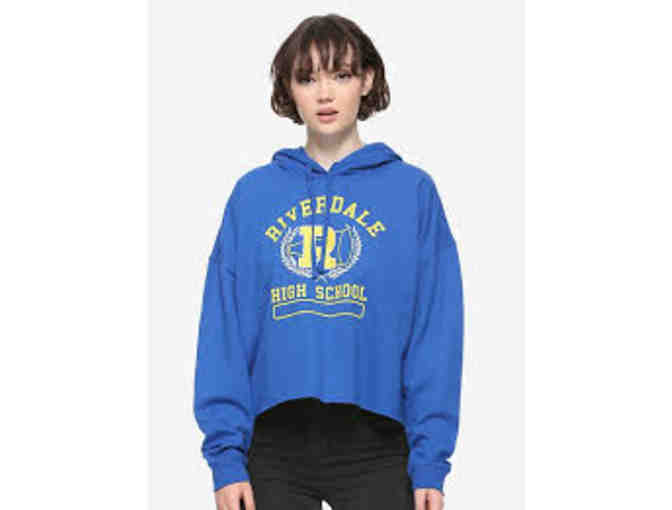 A Vixen's gotta keep warm when it's not game time! Get cozy and cute in this cropped Riverdale High School hoodie inspired by the ones the Vixens wear in the show. Features a drop-shoulder look and drawstring hood.