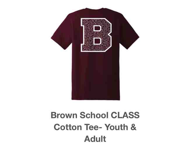 Show your Brown School Spirit with this cotton t-shirt with Brown School logo on the front and the letter "B" on the back filled with the names of all our students! Size Youth XL. Color: Maroon.