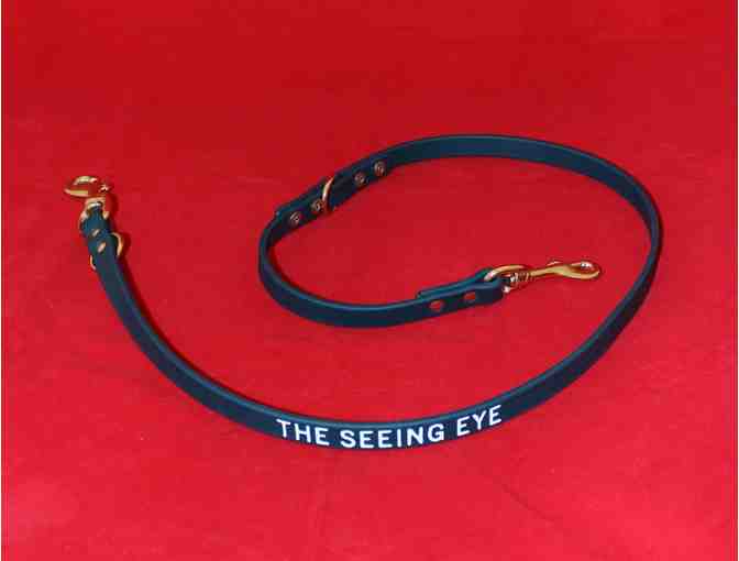 Modeled after the leather leashes used by Seeing Eye® graduates and instructors, this snazzy urethane coated nylon leash is 45" long with brass snaps on both ends and two brass rings, offering maximum versatility. The leash is adjustable to 34" and 24" in length and has "The Seeing Eye" stamped on it in white block lettering. Exclusively designed by the same company that makes The Seeing Eye's leashes and harnesses.