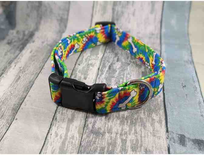 Colorful swirls of blue, green, yellow and red make up the tie dye background of this collar. White bones and paw prints with a black outline are scattered throughout the pattern. This collar is made out of nylon webbing and cotton fabric. The buckles are triglides, made of plastic, and the D-rinds are welded nickel. The collar adjusts from 16" to 22”.