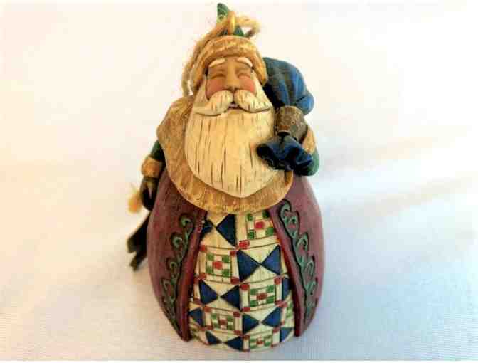 This Jim Shore ornament measures 4" x 1.75" x 2" and features Santa carrying a dark blue sack over his shoulder. He is wearing a red coat and has a jolly expression on his face.