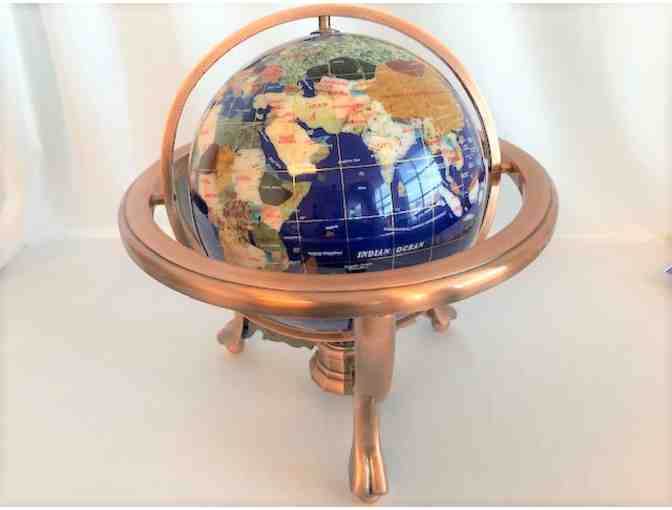 Beautiful Desk Globe - Antique Bronze finished on claw foot stand. Features bright royal blue oceans with the countries of the world. Measures aprox. 13" x 13"