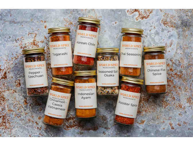 This set contains: Togarashi, Osaka Seasoned Salt, Rooster Spice, Indonesian Ayam, Chinese Five Spice, Thai Seasoning, Szechuan Peppercorns, Vietnamese Cassia, and Korean Chile.