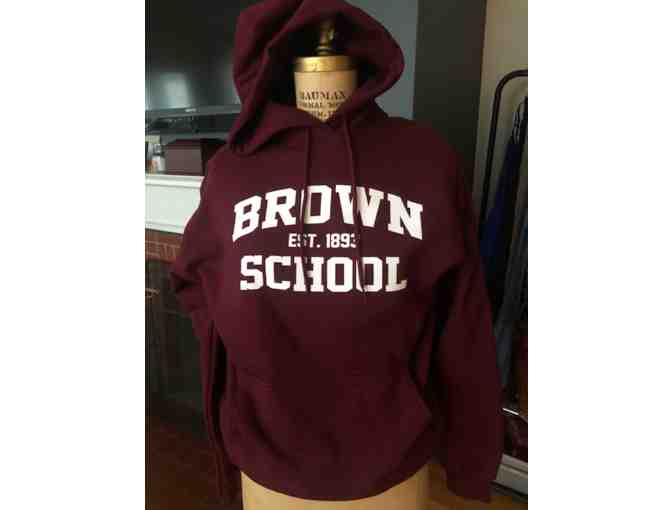 Gildan Hoodie with Brown School logo screenprinted in white. Size Adult Large.