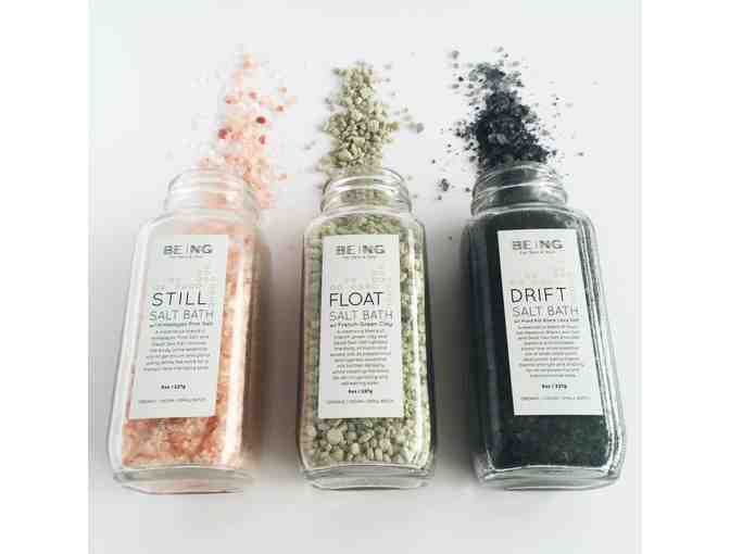 Relax and unwind with a Spa Day No. 37 Sea Salt-Jasmine-Wood-Cream candel and one of the Trio Bath Salts Collection by Live by Being.