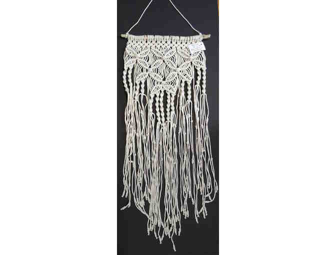 A one of a kind macarame wall hanging knotted by Brown School's Mrs. Mossey, beautiful hung off drift wood.