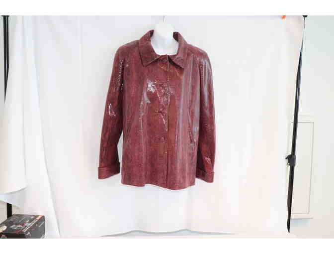 Ladies snake-skin patterned leather jacket in a rich burgundy color. Four-button front closure, full collar, raglan sleeves with cuffs, slanted front pockets, pleated back. Gorgeous any time of the year.