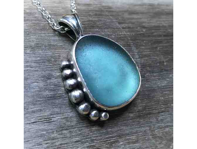 A vibrant, teal piece of sea glass found in Japan. Set in fine and sterling silver with handmade bead detail and a solid sterling back. A 16” sterling chain is included. Handmade by Señora Bosco.
