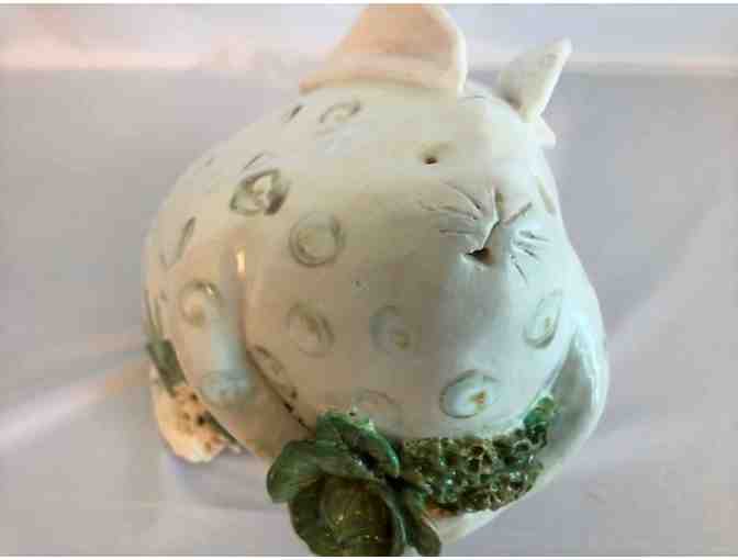 This stoneware bunny is safe for your garden. The chubby bunny with laid back ears is finished in an ivory smooth glaze finish accented in a scattered pattern of light green flowers. He measures 9 by 8 inches.