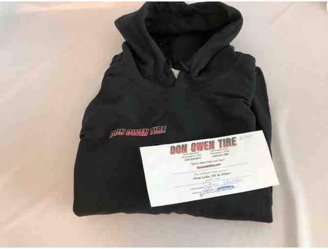 Win an oil change and a sweatshirt from Don Owen Tire in Bloomington, IL. The XL size hooded sweatshirt is navy in color with Don Owen's logo on the front and back.