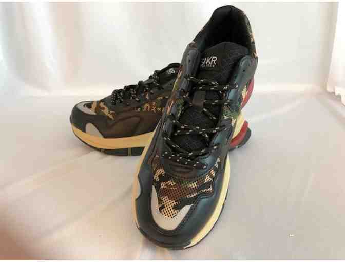 Own a pair of men's sneakers from SNKR Project. The sneakers are the Park Avenue style and are Olive, Camo and Red in color.