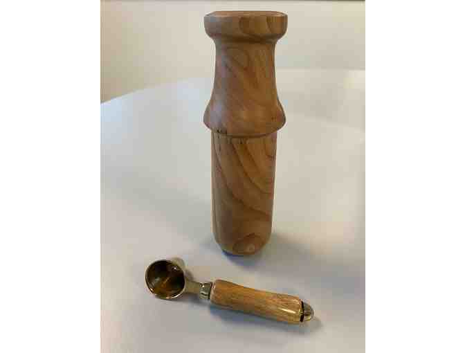 7 1/2" high candle holder made in 2002, candle snuffer (wood handle,brass snuffer)