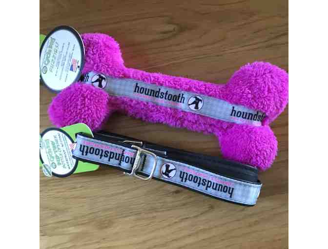 XL orthopedic dog bed, USA made, with a deep red removable cover and also a Houndstooth branded dog leash and toy