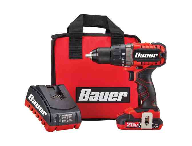 Bauer Hypermax Lithium Drill/Driver Kit, from Harbor Freight,comes with 1/2 in. 20V compact drill/driver, 1.5Ah battery, charger, 2 impact bits and a rugged tool bag.