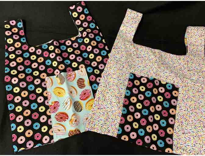 "This set of 2 'indestructible' shopping bags is hand-made out of pre-shrunk cotton. Sturdy and machine washable, each bag can be folded down into its exterior pocket for compact storage."