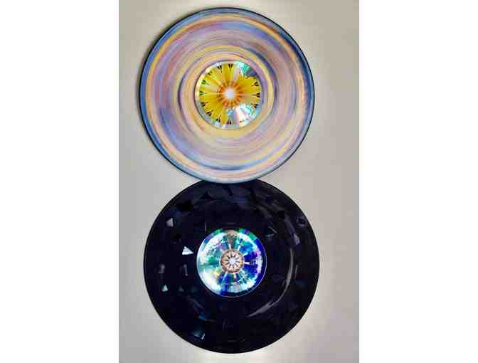 Dimensions: 12" diameter each - Each hangs separately. One is on a block the other has a hole for hanging. They can overlap or hang apart.