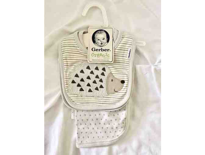 Gerber gender neutral bibs and burp cloth, organic cotton. Includes two bibs and one burp cloth.