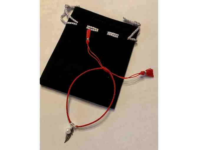 Chuvora - 925 Sterling Silver, Adjustable Red Tassel Drawstring Wrap Bracelet, 7-9", with feather and pearl charms
