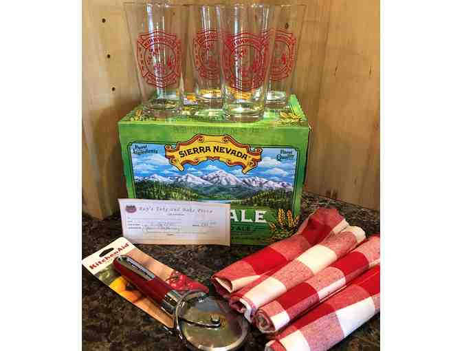 Pizza Night! 4 Kirkwood Volunteer Fire Department Pint Beer glasses, $20 gift card from Ray's pizza (good for a giant gourmet pizza), 6 pack of craft beer, 4 buffalo checked red and white napkins, pizza cutter.
