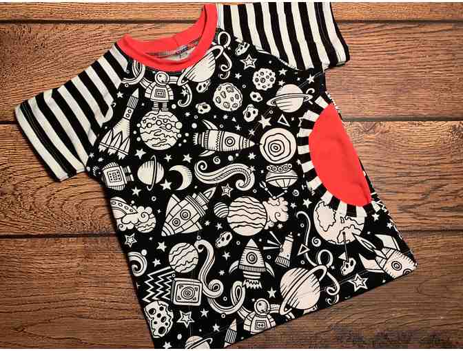 Handmade by FTCNS parent Erin English Bailey, this short-sleeved t-Shirt has a front treasure pocket and outer space and astronomy themed images. T Shirt is soft and stretchy, machine washable, slim-fitting 3T.
