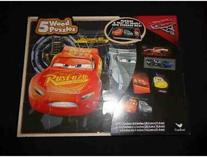 Five Disney Pixar Cars wood puzzles with a storage box tray.