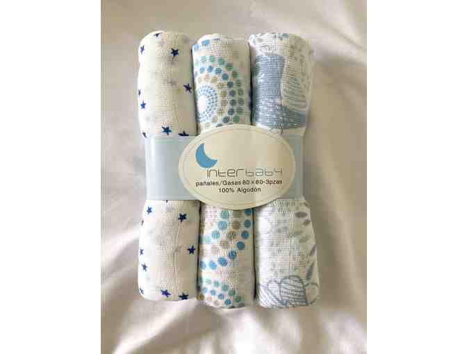 Set of three swaddle blankets in various blue tones by Interbaby. Made of 100% algodon cotton.