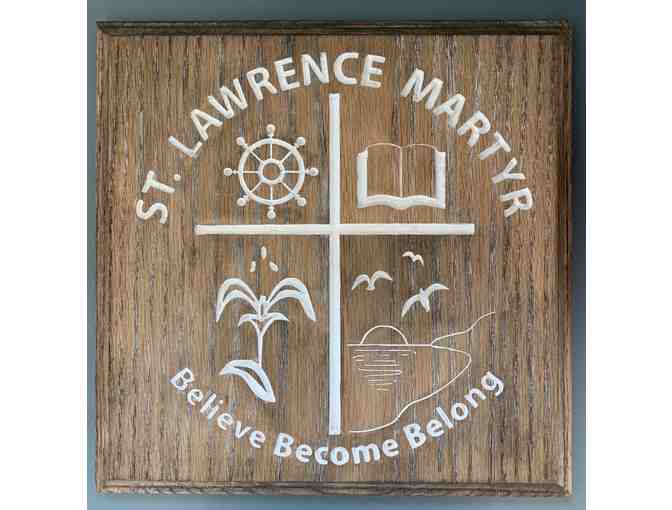 Custom, one of a kind engraved wood sign featuring the St. Lawrence Martyr School emblem. This custom made sign features the SLM school emblem including the words "Believe, Become, Belong" engraved on solid oak wood stained with ebony stain. The piece is 11" x 11" and comes with built in hardware for hanging. Show your SLM pride with this one of a kind original!