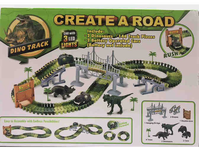 You are bidding on a Dino Track Create a Road which includes 2 dinosaurs, 144 track pieces, and 2 battery operated cars (batteries not included). Easy to assemble with endless possibilities!