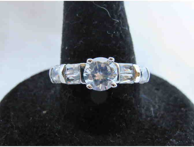 Glittering white gemstone square-cut stone and set in a gorgeous sterling silver high polish band. The four smaller stones and large stone create a dazzling look.