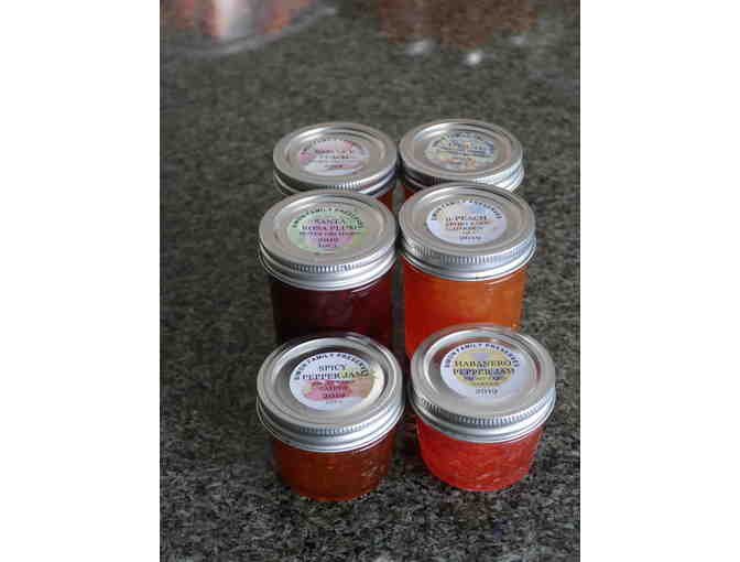 A selection of six of the best of Simon Family Preserves. 4 oz. each of "Spicy Pepper Jam" (mildly spicy) and "Habanero Pepper Jam" (VERY spicy), and 8 oz. each of Loquat Caramel Butter Jam (limited edition), Babcock Peach, micro-Peach, and Santa Rosa Plum.
