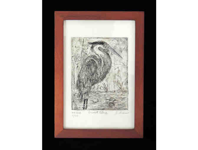 An etching by Jim Sears, using zinc plate and copper sulfate to etch. “Great Blue” is a 3 x 4" intaglio print.